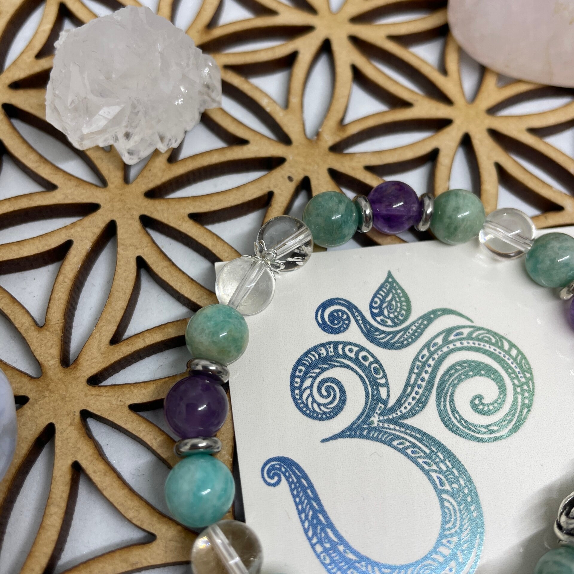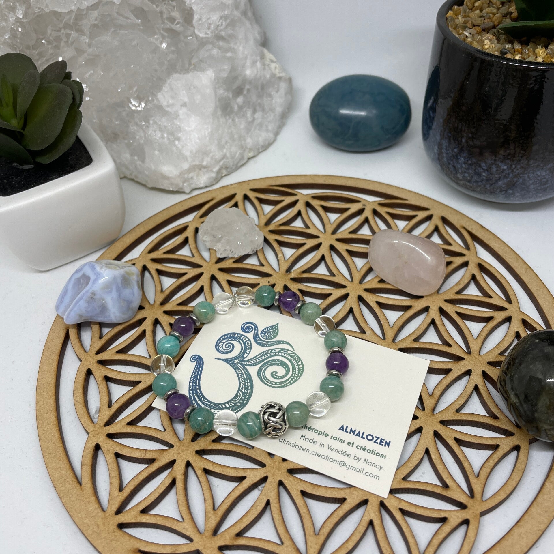 Bracelet en pierres naturelles 8 mm en Améthyste, Amazonite et Cristal de roche.