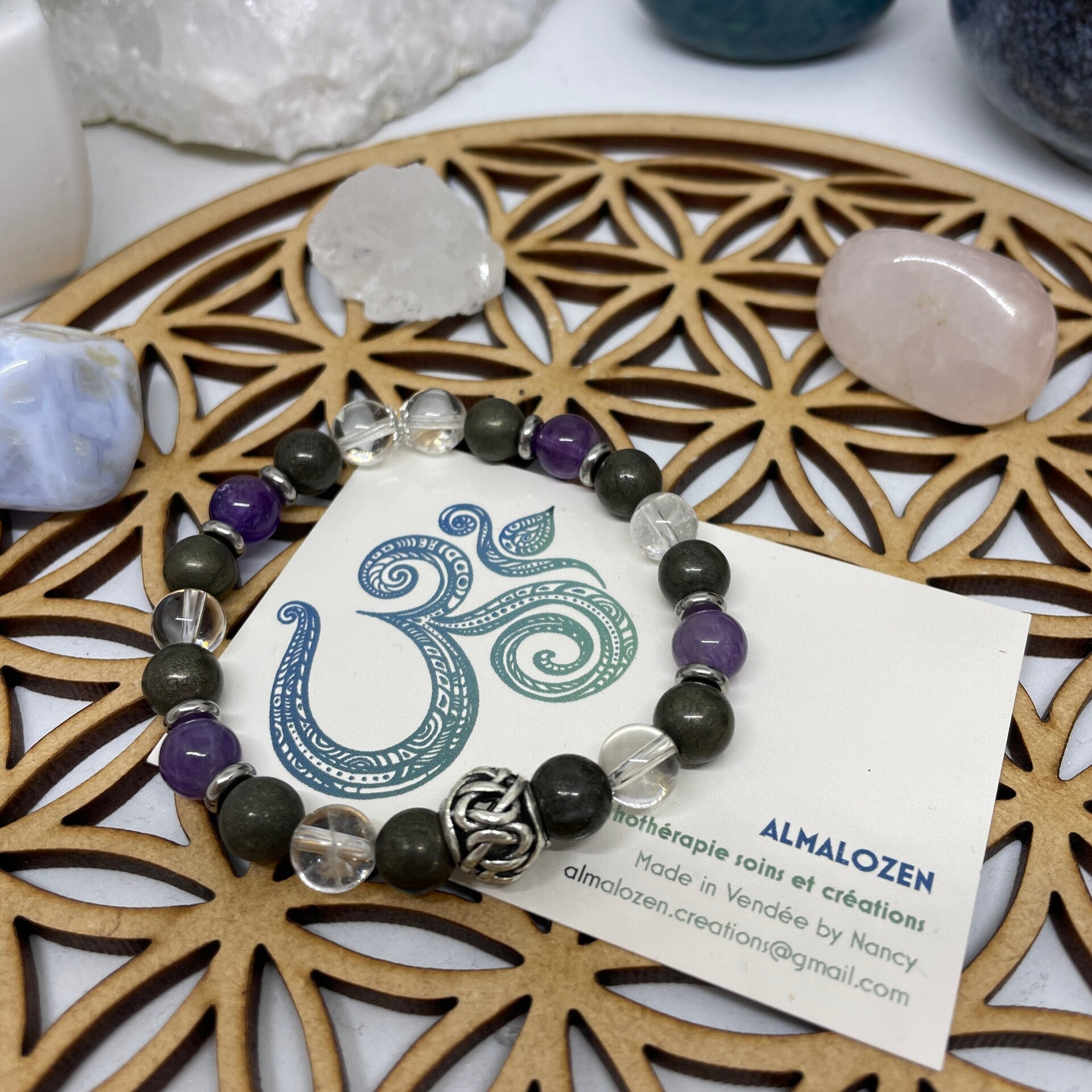 Bracelet en pierres naturelles 8 mm en Améthyste, Pyrite et Cristal de roche.
