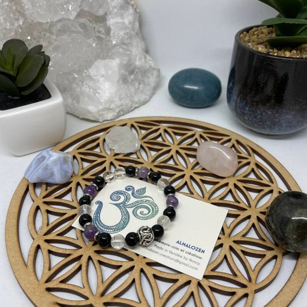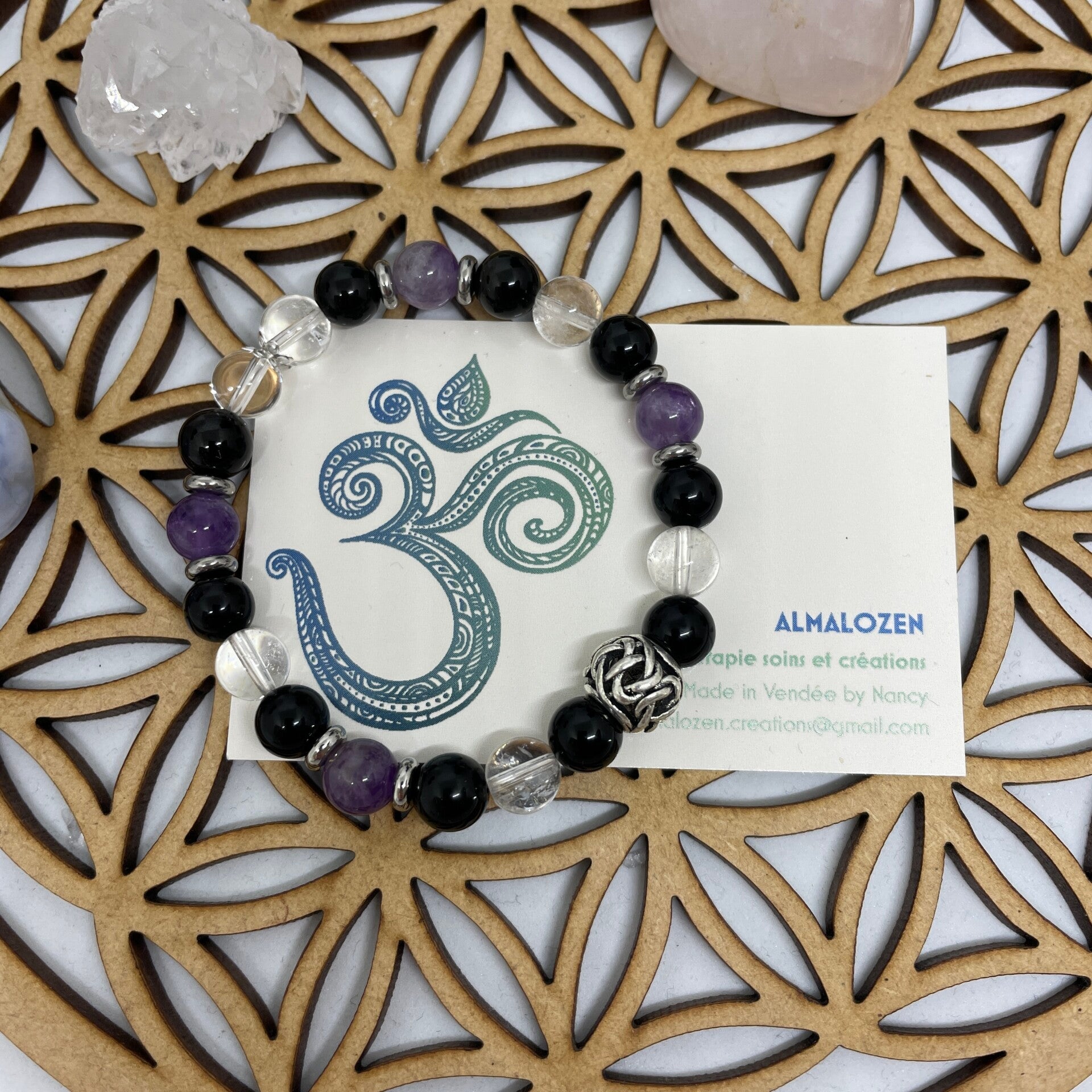 Bracelet en pierres naturelles 8 mm en Améthyste, Onyx et Cristal de roche.