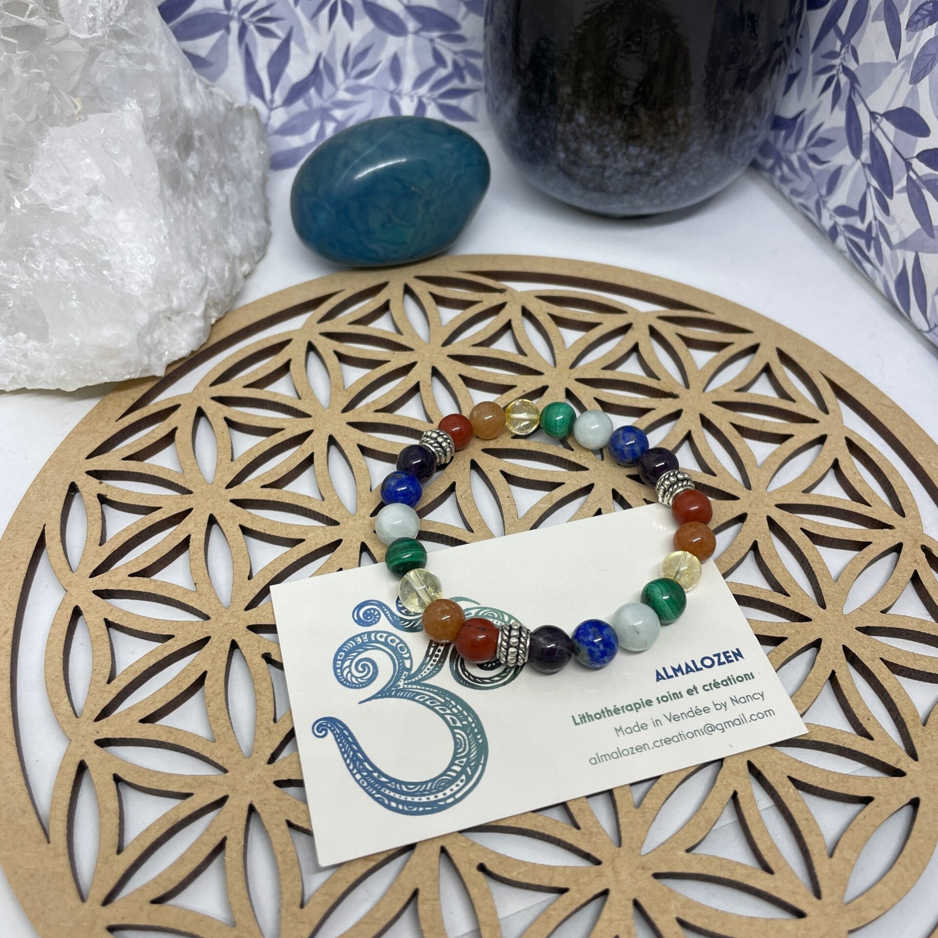 Bracelet 7 chakras en Aigue-marine, Lapis-lazuli, Citrine, Jaspe rouge, Cornaline, Améthyste et Malachite.