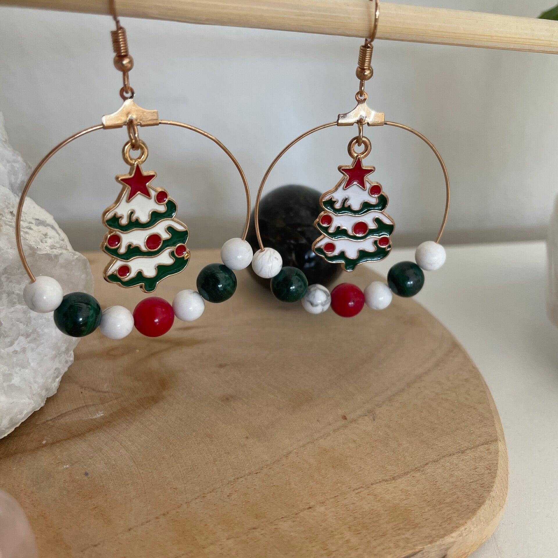 Boucles d'oreilles dorées, avec sapin et pierres naturelles Howlite, Corail rouge et Malachite.